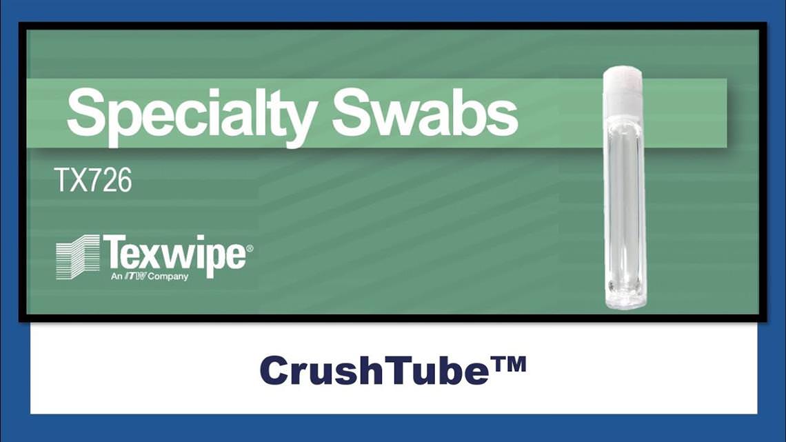 Texwipe’s CrushTube™ system includes a 100% polyester nonwoven material head attached to a protective polybutyrate external vial enclosing an internal vial made of soda lime glass (Type III USP glass), that contains USP-grade 91% IPA / 9% DIW solution.