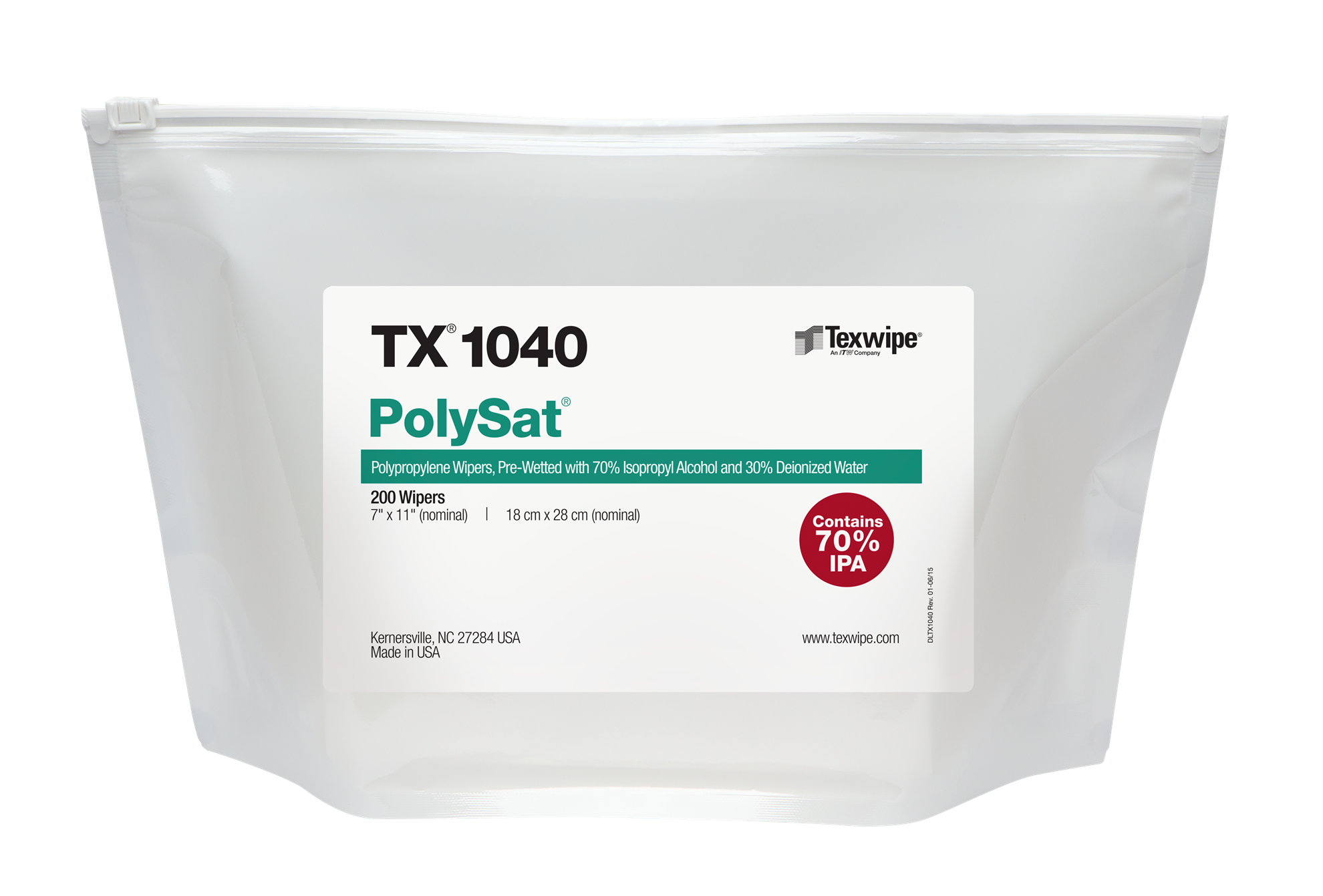 PolySat® TX1040 pre-wetted cleanroom wipers are made from 100% melt-blown polypropylene with a cut edge, creating a soft wiper ideal for use on sensitive surfaces. TX1040 is pre-wetted with 0.2 µm filtered 70% IPA / 30% DIW for ease of use. The wipes provide a consistent, optimized cleaning efficiency with repeatable wetness and VOC levels. TX1040 PolySat® wipers are packaged in easy-to-use, reclosable slider bags, reducing solution evaporation that preserves the consistent wiper wetness level.