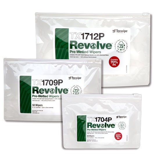 Revolve™ wipers are pre-wetted with 0.2 µm (micron) filtered USP-grade 70% IPA / 30% DIW and provide consistent, optimized cleaning efficiency with repeatable wetness and VOC levels.