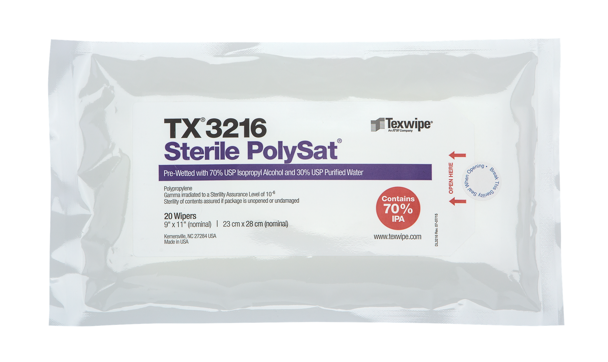 PolySat® TX3216 pre-wetted cleanroom wipers are made from 100% melt-blown polypropylene with a cut edge, creating a soft wiper ideal for use on sensitive surfaces. PolySat® TX3216 wipers are pre-wetted with 0.2 µm filtered USP-grade 70% IPA / 30% DIW for ease of use. The wipes provide a consistent, optimized cleaning efficiency with repeatable wetness and VOC levels. TX3216 is packaged in easy-to-use, peel-and-reseal bags reducing solution evaporation that preserves the consistent wiper wetness level.