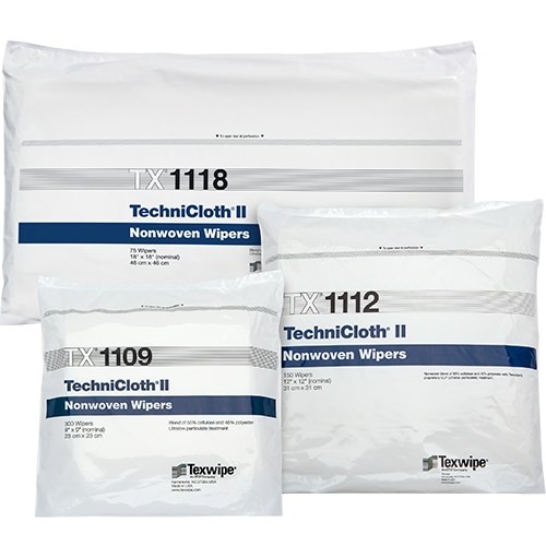 TechniCloth® II cleanroom wipers are made from proprietary coated 45% polyester / 55% cellulose nonwoven material with a cut edge, and are cleanroom manufactured. The Manufacturing process of the cleanroom wiper incorporates an Ultra-Low Particulate treatment that significantly reduces particles and extractables creating a nonwoven wiper suitable for more critical operations.