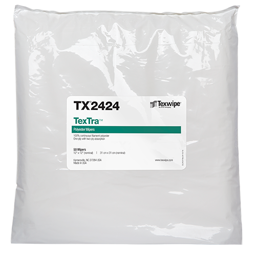TexTra™ dry cleanroom wipers are made from 100% polyester with a cut edge, cleanroom laundered. TexTra® wipers are thick, cleanroom polyester knit wipers. These single-ply wipers have the liquid-holding capacity of two-ply wipers. TexTra combines this high absorbency with great abrasion resistance, resulting in a wiper that is great for wiping and cleaning surfaces, equipment, and parts. Furthermore, it is suitable in applying and removing lubricants, adhesives, residues, and other solutions including disinfectants. Can be autoclaved for sterile or aseptic environments.