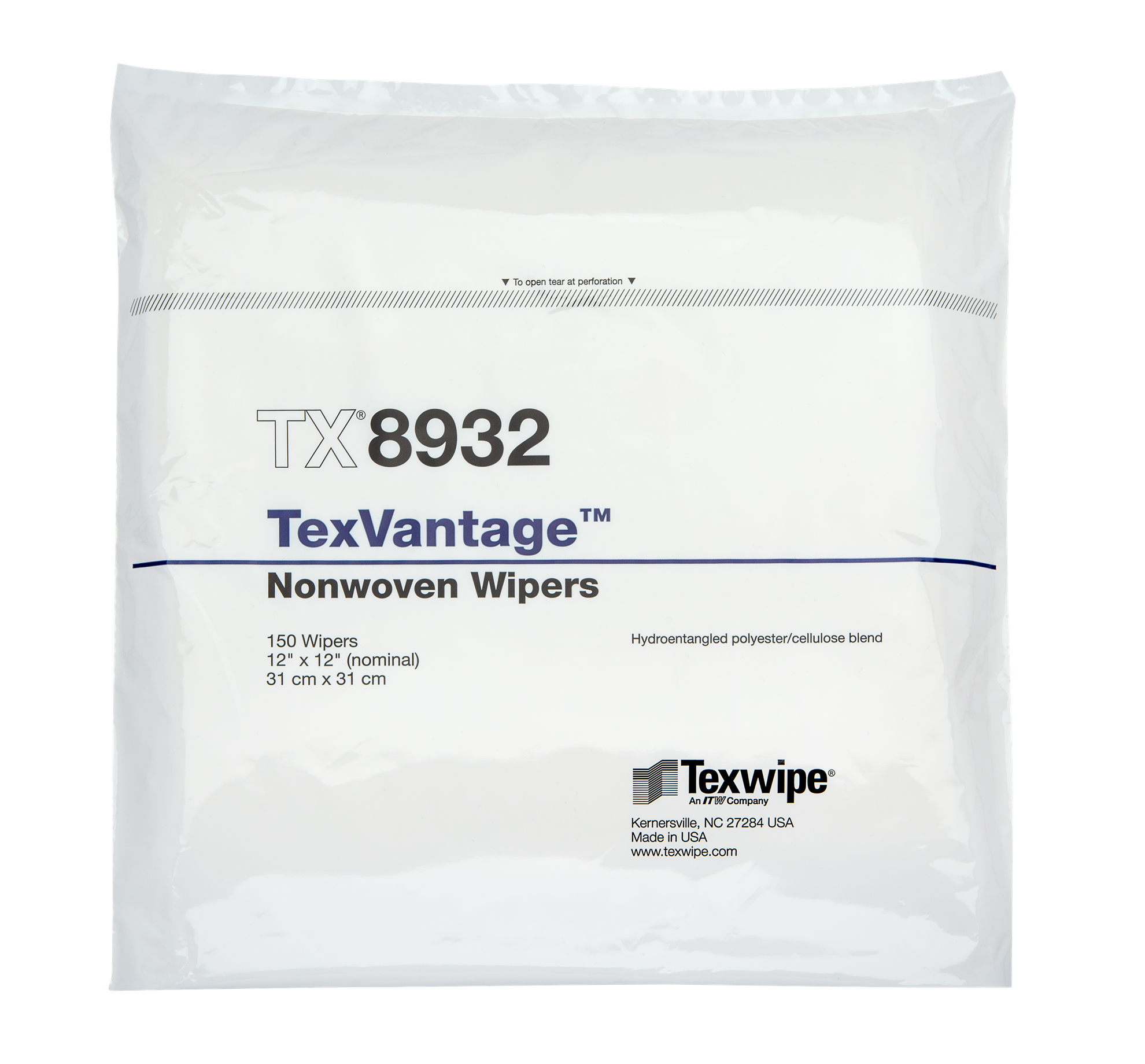 TexVantage™ TX8932 dry nonwoven cleanroom wipers are made from 40% polyester / 60% cellulose material with a cut edge, and are cleanroom manufactured. These cleanroom wipers are manufactured to provide a wiper suitable for general cleaning and wiping.