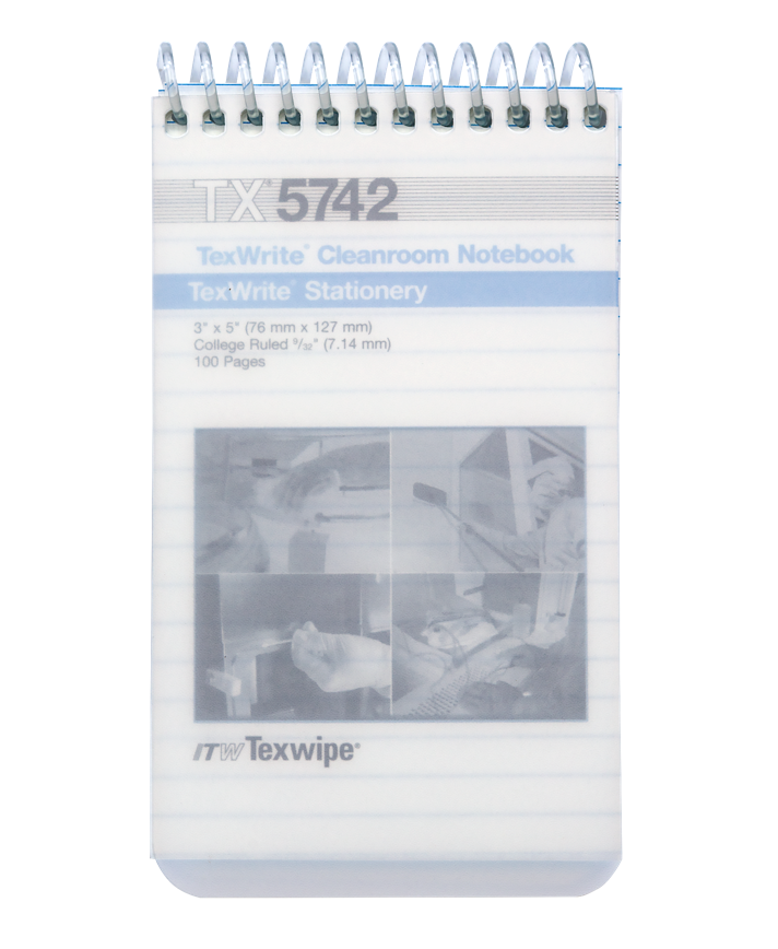 TexWrite® spiral-bound cleanroom notebooks are used for note taking and data recording in the cleanroom. These cleanroom notebooks feature high-density polyethylene covers, plastic spirals and durable TexWrite® copolymer cleanroom paper. Pages are printed with IPA resistant, low-sodium ink for reduced ionic contamination. Notebooks lie flat and pages rotate freely for ease of use.