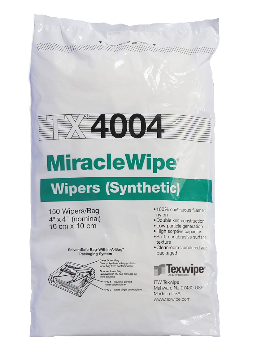 MiracleWipe® TX4004 dry cleanroom wipers are made from 100% nylon knit material with a cut edge, cleanroom manufactured. The unique structure of the wipe allows it to have a unique texture that provides scrubbing surface for cleaning.